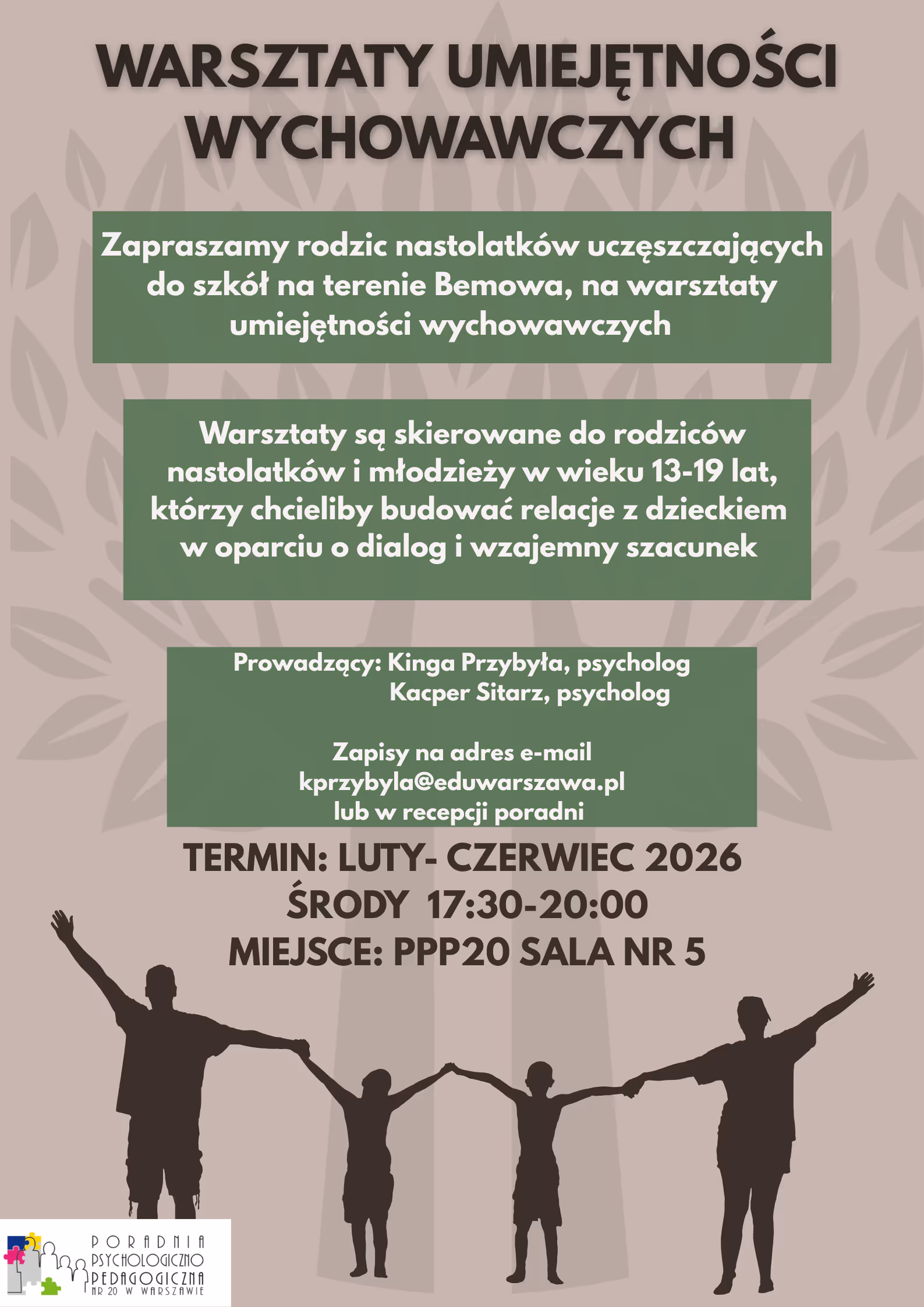 Zapisy na warsztaty na adres e-mail kprzybyla@eduwarszawa.pl lub w recepcji poradni.